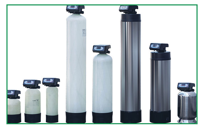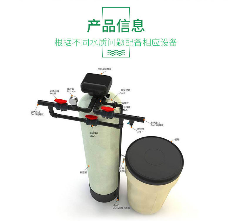 原水在一定的压力(0.2-0.6Mpa)、流量下,通过控制器阀腔,进入装有离子交换树脂的容器(树脂罐),树脂中所含的Na+与水中的阳离子(Ca2+,Mg2+,Fe2+……等)进行交换,使容器出水的Ca2+,Mg2+离子含量达到既定的要求,实现了硬水的软化。